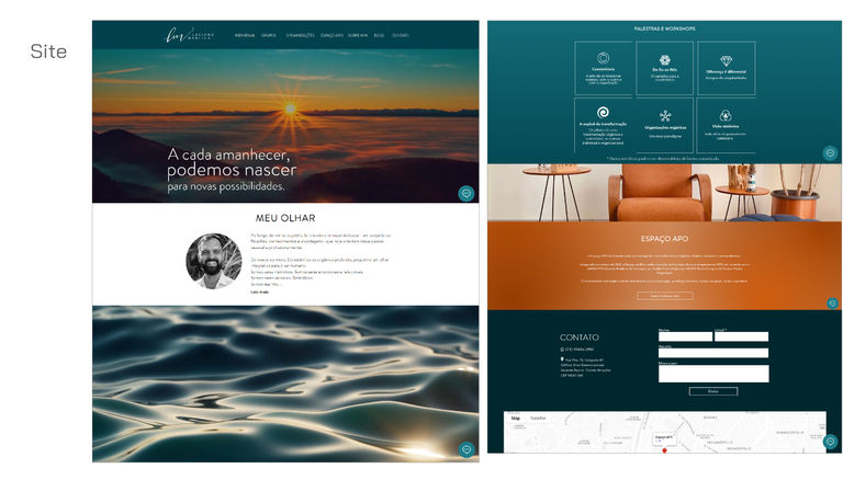 Com o objetivo de criar uma nova identidade para a marca, modifiquei o logo de forma sutil e criei um novo padrão de design que transmite seriedade, sofisticação e confiança. As cores e fontes foram pensadas para expressar elegância, e os elementos seguem uma linha natural, com linhas finas e fotos mostrando o amanhecer, que é a essência da marca: renascimento.